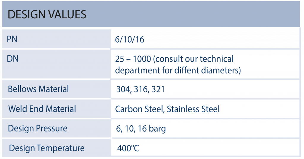 Disponível para gás de escape, meio líquido e vapor. Os foles são calculados de acordo com as últimas normas EJMA. Também, os compensadores do tipo ponta de solda podem ter um fole duplo que são concebidas para absorver a lateral mais alta movimentos.